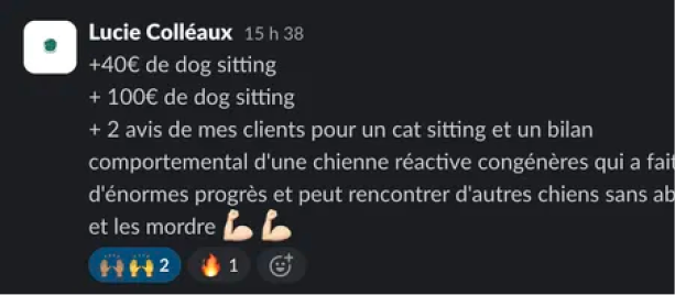 Résultats de ces dernières semaines :+ 100€ de dog sitting + 40€ de dog sitting + 1 cliente de closée pour un cat sitting + 135€ de cette même cliente + 60€ de dog sitting + 2 nouveaux partenaires professionnels
